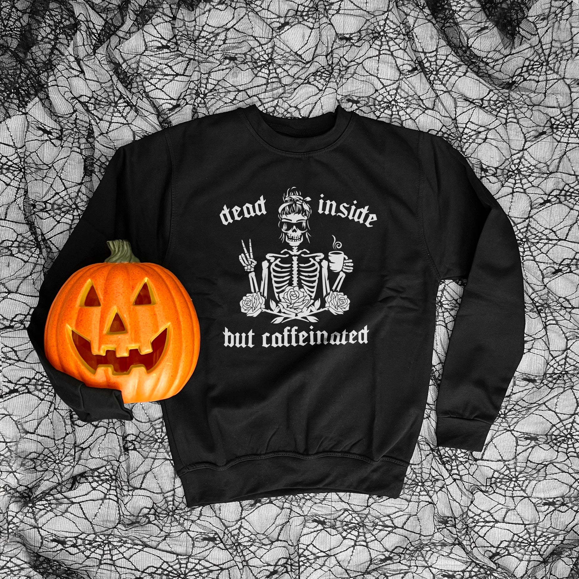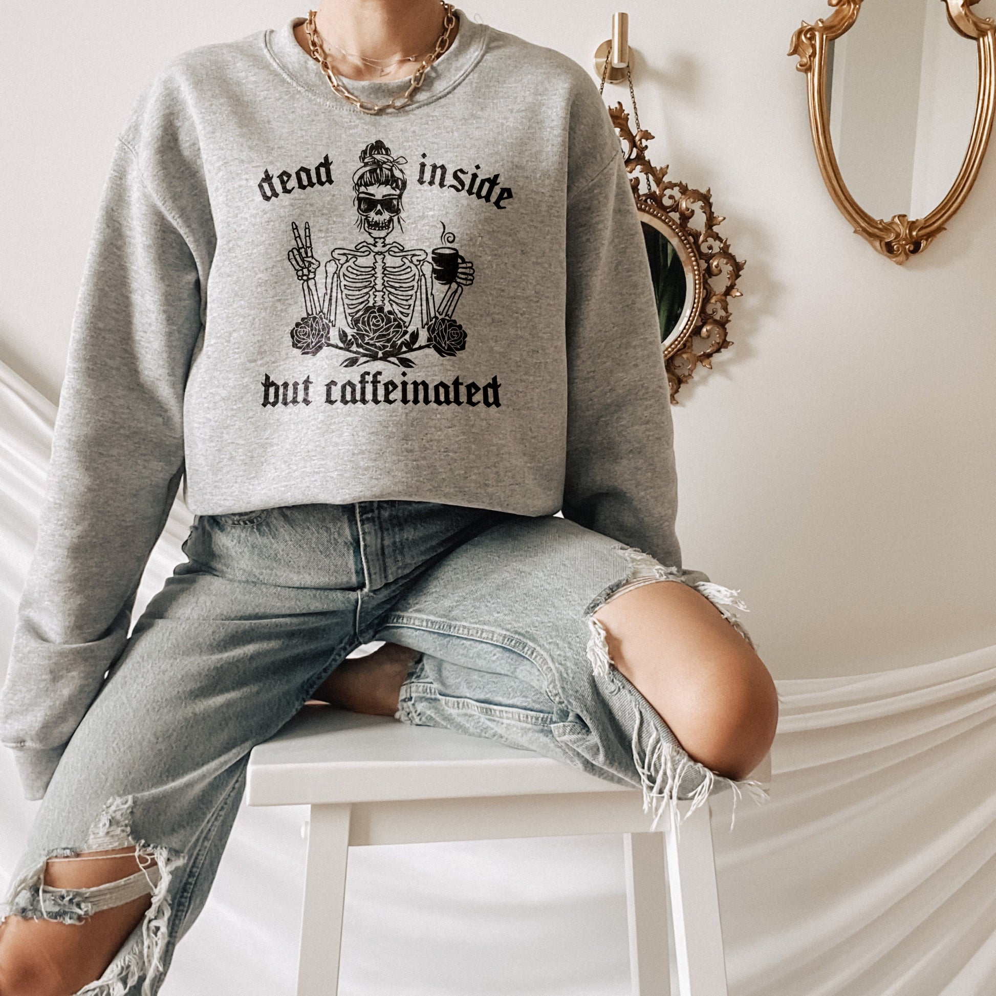 Halloween Sweatshirt - Dead Inside But Caffeinated - Womens Halloween Sweater - Fall Sweatshirt - Female Skeleton With Coffee Sweatshirt