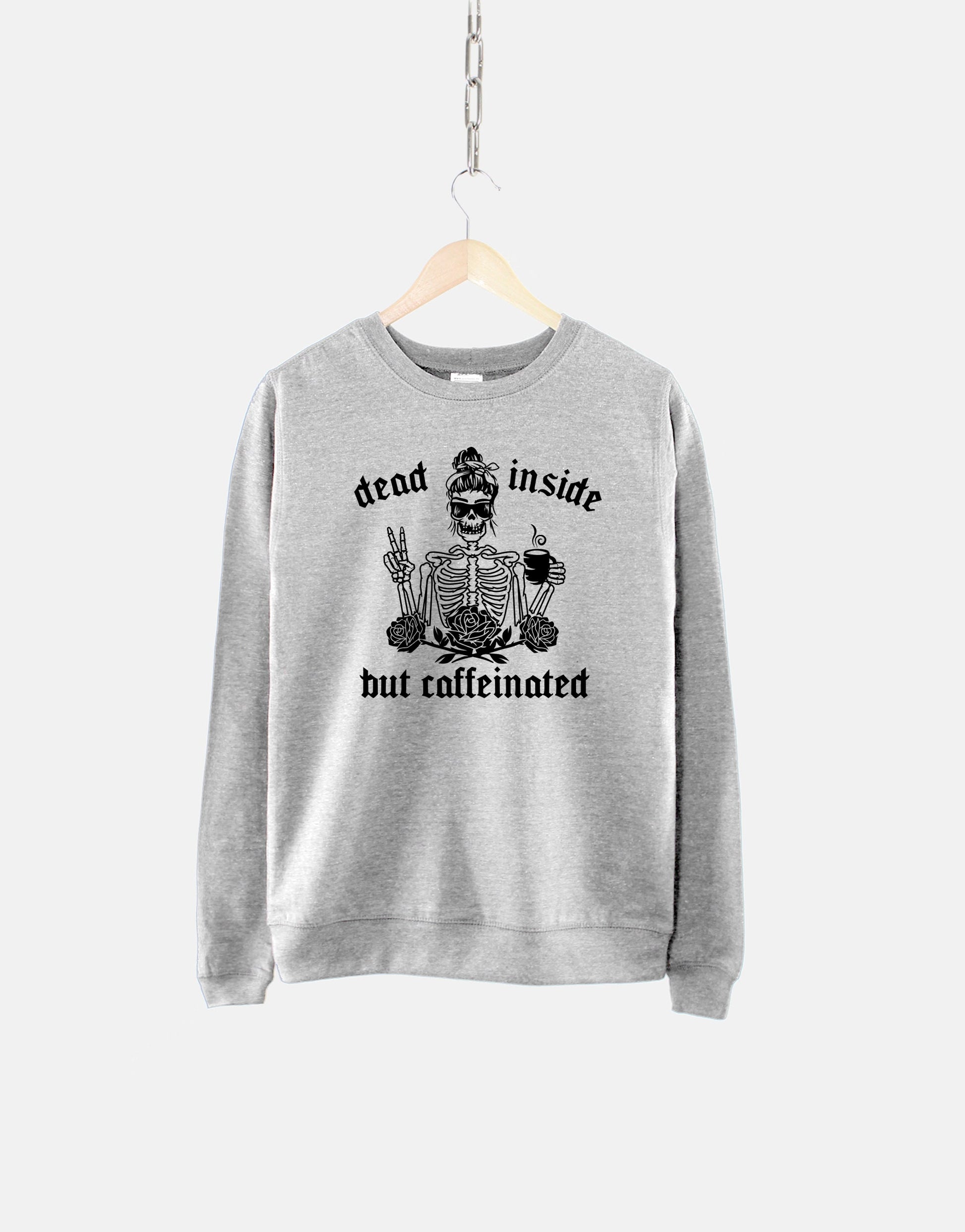 Halloween isn't just a holiday, it's a way of life. And this stylish black gothic style sweatshirt is the perfect way to show your love for all things spooky, creepy and caffeinated. Featuring a fun coffee drinking skeleton illustration and the words 'Dead inside but caffeinated', this will be your new favorite top! This Halloween unisex crew neck sweatshirt is made of premium quality cotton/polyester blend for a great quality soft feel, and comfortable retail fit. Our soft textile print will not crack or fade which ensures long-lasting print quality so your garment stays looking fantastic.